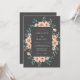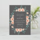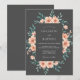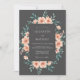 This design features soft peach roses and lush teal eucalyptus leaves set against a deep charcoal background. The mood is sophisticated and moody, perfect for a romantic evening event. Delicate watercolor textures add an artistic touch to the botanical arrangement. The contrast between the dark backdrop and the warm floral tones creates a striking visual impact.