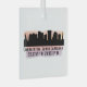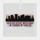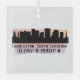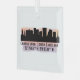 Glass ornament features skyline silhouette of Charleston SC with map coordinates on a watercolor splash background,