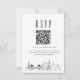 A minimal wedding rsvp QR code card featuring a stylised skyline representing the beautiful city of Charleston, South Carolina. Replace the QR code with one featuring a link to your website to help make responding to your wedding event easier for your future guests.