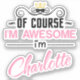 Of Course I'm Awesome I'm Charlotte - name in mixed black and pink casual and decorative cursive font lettering with whimsical scroll accents and topped with a golden crown.