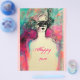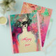 Elegant and whimsical lady with a sophisticated venetian feather mask in vibrant pink,green,fuchsia,black,white colours, inspired from Comedy of Art (Commedia dell' Arte ) and Carnival of Venice , watercolor painting with gold and silver foil .