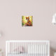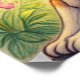 This whimsical poster features a charming illustration of an orange tabby cat. The cat is sitting with its paws neatly tucked in front of it, giving a poised and friendly appearance. It has large, expressive green eyes and a small pink nose with delicate whiskers. The cat's fur is detailed with stripes and variations in orange tones, creating a realistic texture. The background features a window frame with vibrant flowers and foliage. There are yellow daisies and pink blossoms visible, adding a cheerful and natural element to the scene. The overall style of the image is reminiscent of a children's book illustration, with soft lighting and a warm color palette. The light source appears to be coming from behind the cat, creating a gentle glow around its form. Finished in a mixed media art print.