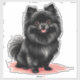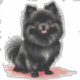 A cute, fluffy black Pomeranian illustration with bright eyes and a pink tongue. The playful pup sits on a soft pink shadow, perfect for family, pet, and lifestyle themes.