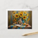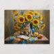 charming still life featuring a cat with a sunflower bouquet and an old book, surrounded by fruits and flowers.