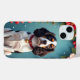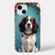 Charming dog sitting in a playful pose, surrounded by a decorative floral border. The dog has a mostly white coat with black patches and distinctive brown markings on its face. It wears a red collar with a bell that adds to its adorable appearance.