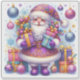 A whimsical Santa Claus adorned in a vibrant, purple outfit stands joyfully surrounded by beautifully wrapped presents.