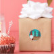 This captivating Christmas sticker features a charming gnome with a striped red hat and a white beard, the focal point of a festive, snowy scene. He stands against a cool teal-blue sky where large snowflakes fall around dark pine tree silhouettes. The design includes a ready-to-use, light brown gift tag area pre-printed with "Merry Christmas" and clear "To:" and "From:" fields in red script. A decorative red and white garland borders this customisable space. This sticker acts as an all-in-one personalised gift tag, adding whimsical, storybook charm to your holiday wrapping.