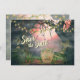 This Save the Date wedding announcement features a charmingly spooky graveyard. There are a few old gravestones with a background of twisted trees decorated with enchanting flower lights and a beautiful dark pinkish sky.