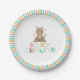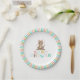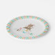 Cute baby shower paper plates with pinwheel stripes in pink, yellow, green, and blue with a kangaroo momma and her little kangaroo baby.