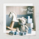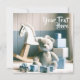 A cosy and charming kids' room featuring a soft, grey teddy bear, a white and blue wooden rocking horse, and various blue and white building blocks. The room is decorated in a soothing palette of blue and white tones, providing a calm and inviting atmosphere for play and relaxation