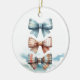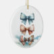 A delightful arrangement of three bows, each featuring a unique pattern of subtle stripes, plaids, and checks in gentle earthy tones, all enhanced with a hint of watercolor. This stylish, bow-themed ornament will add a touch of elegance to your tree.