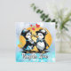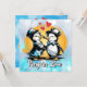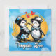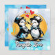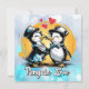 This whimsical illustration showcases a pair of penguins in tuxedos, celebrating love with hearts and charming outfits in a vibrant design.
