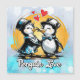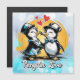 This whimsical illustration showcases a pair of penguins in tuxedos, celebrating love with hearts and charming outfits in a vibrant design.