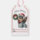 A delightful Christmas tag features a playful racoon in a Santa hat, holding a wreath amid holiday decorations. Perfect for adding cheer to your festive gifts this season.