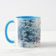 This charming design features a cute reindeer in a blue-grey scarf in front of a wintry wonderland, with decorated snowy Christmas trees, a cosy festive house, and a pond. Your or your recipient' name appears in a maroon dark red) in the middle of the cup (opposite the handle vs. on either side).Make sure to type the name you want in the Personalise section. This design is shown on a combination mug with sky blue - almost a turquoise - handles and cup inside, but many other options are available, both plain and fancy.