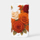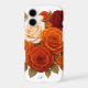 A stunning floral case showcasing rich autumn roses in shades of orange, red, and cream, arranged in a warm and elegant bouquet with a personalised monogram, classic and romantic.