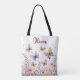 This personalised tote bag features a dreamy watercolor butterfly garden where colourful-winged butterflies dance among soft wildflowers. With a soothing background of pink, blue, and peach hues, this charming illustration creates a magical and serene atmosphere.