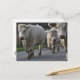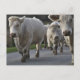 A postcard with a herd of Charolais cattle walking down the road close to and looking at the camera.