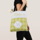 Our custom monogram tote bag will make anyone smile adorned with a grey chartreuse damask and polka dot print and white scroll frame for your initial. Customise with your name and initial. View our full line of products in our Zazzle store.