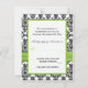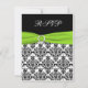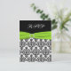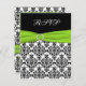 This black and white damask rsvp card with a lime green PRINTED ribbon and jewelled brooch matches the wedding invitation shown below. If you require any other matching items, or would like it in another colour combination, please email niteowlstudio@gmail.com with your request.
