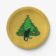 A silhouette of Théophile Steinlen's black cat for the Le Chat Noir club in a modern setting for Christmas featuring a green tree with ornaments and the cat in a Santa's hat.