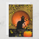 A silhouette of Théophile Steinlen's black cat for the Le Chat Noir club in a modern setting for Thanksgiving featuring a large orange moon, a pumpkin, black-eyed Susans, and the cat in a pilgrim's hat.