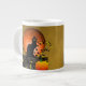 A silhouette of Théophile Steinlen's black cat for the Le Chat Noir club in a modern setting for Thanksgiving featuring a large orange moon, a pumpkin, black-eye Susans, and the cat in a pilgrim's hat.