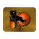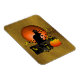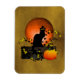 A silhouette of Théophile Steinlen's black cat for the Le Chat Noir club in a modern setting for Thanksgiving featuring a large orange moon, a pumpkin, black-eye Susans, and the cat in a pilgrim's hat.