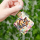Talkative chipmunk sitting up on a small branch with its mouth open. Pink blossoms drift into a watercolor wash background.