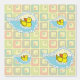Chaucer the yellow rubber ducky floats among the bubbles in a bathtub, waiting for his next adventure. A funky pattern of colourful squares and circles on a yellow base creates a fun backdrop for the bubble enclosed scene.