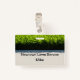 Professionally designed lawn care service employee name badges in a two side design with image of perfect lawn in the background and text space you can customize online in a budget friendly design.