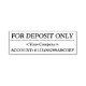 This traditional rubber stamp design features the message "FOR DEPOSIT ONLY", plus a personalised personal/business name and account number. It might perhaps be used by an office clerical worker, a small business operator or an individual to quickly add a restrictive indorsement to a cheque.