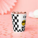 Simple one happy dude 1st birthday paper cup for a baby boy featuring a yellow face and black glasses, retro style text and black and white checkerboard pattern.