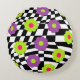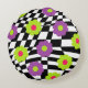 Your couch or bed will look super groovy with this round pouf style pillow. This funky throw pillow features flowers in shades of lime green , pretty purple , and hot pink, against an abstract black and white checked background.