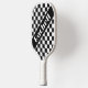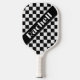 This paddle design brings graphic punch with a bold black-and-white chequerboard layout. A sharp diagonal stripe cuts across the grid, adding visual tension and sleek symmetry. The white text pops with clarity and character, balanced by a crisp grip that blends texture with simplicity. It’s perfect for players who love contrast, movement, and the satisfaction of standing out—one serve at a time.