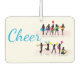 Air freshner shown with a cheerleading print on the front and cheerleader text on the back.