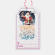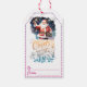 A delightful Christmas gift tag features a jolly Santa Claus waving with a bag of presents.