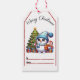 A delightful Christmas tag featuring a smiling snowman in a blue hat holding gifts next to a stylishly decorated green tree, perfect for adding holiday cheer to presents.