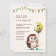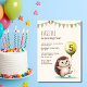 Adorable kid's birthday invitations featuring a cute cheerful hedgehog holding a balloon and party flag.
