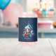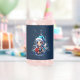 Cheerful elf who shines with her long, flowing blue hair. Her hair seems to shimmer in the soft light, giving her a magical glow. On her head she wears a cute blue Christmas hat decorated with a white pompom that matches her outfit perfectly. Her warm smile radiates joy and warmth, giving viewers a sense of festive anticipation. The background of the design features stylised white Christmas trees, and the sky is dotted with sparkling white stars that shine like little diamonds, creating a magical atmosphere.