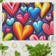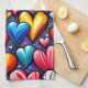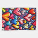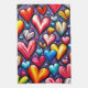 A vibrant and colourful array of hearts fills the scene, each varying in size and shade, against a dark background. The hearts display a mix of reds, blues, yellows, and pinks, creating a lively and cheerful atmosphere.