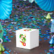 A cheerful jack in the box with bells on his hat popping out of a red and yellow box. This product has a monogram which can be personalised.