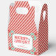 This favour box features a cheerful holiday greeting in a modern victorian style typography on a pink and red striped background. You can personalise with a name.
