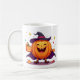 This adorable mug features a cute, cartoon pumpkin character with rosy cheeks, wearing a black witch hat and purple cape. The pumpkin holds a tiny jack-o’-lantern and gives a cheerful thumbs-up, surrounded by colourful candies and starbursts.