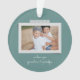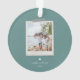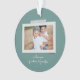 Cheerful sentiments snapshot ornament. Features, 2 framed photos with scrapbook style washi tape accents, 3 template text lines for your message, names and year with heart detail in white on seafoam blue colour backgrounds.