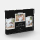 Cheerful sentiments snapshot photo block. Features, 3 framed photos with scrapbook style washi tape accents, two template text lines for your message and names with heart detail in white on black slate colour background.