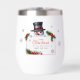 The design features a cheerful snowman holding a sign with holiday greetings on a simple white background. This wine tumbler is guaranteed to bring delight to wine connoisseurs as they savor their favorite beverage during the winter months.