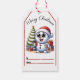 A delightful Christmas tag showcases an adorable snowman with a coffee cup, surrounded by holiday gifts and a decorated tree, capturing the joy of the season.