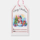 Festive Christmas tags showcase a joyful snowman adorned with a scarf and hat, surrounded by vibrant gifts and a glowing tree, capturing the spirit of holiday cheer.