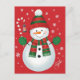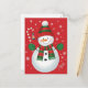 Send a smile with this vibrant and charming illustration of a classic snowman! Against a bright red background with falling snowflakes, this snowman is bundled up in a festive red and green tartan plaid scarf and matching hat. He holds a whimsical candy cane lantern and wears cosy green mittens. This design captures the joy and warmth of the season and is perfect for a traditional, cheerful Christmas greeting for all ages.